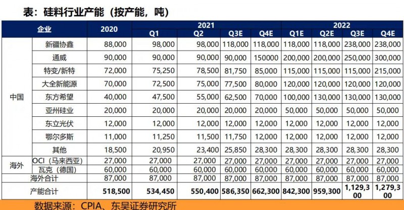 02、預(yù)計到2022年末國內(nèi)硅料產(chǎn)能將翻一番,通威股份、保利協(xié)鑫等龍頭企業(yè)的規(guī)模壁壘愈發(fā)提升