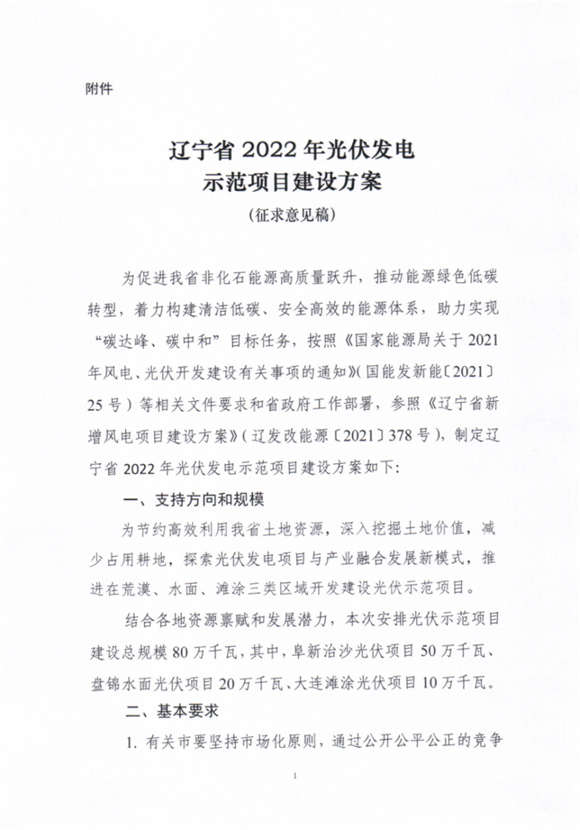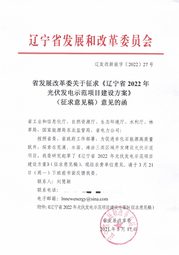 3月17日,遼寧省發(fā)展改革委關(guān)于征求《遼寧省2022年光伏發(fā)電示范項(xiàng)目建設(shè)方案》(征求意見稿)意見的函。