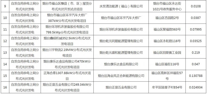 煙臺(tái)市無(wú)補(bǔ)貼平價(jià)上網(wǎng)光伏發(fā)電項(xiàng)目信息表