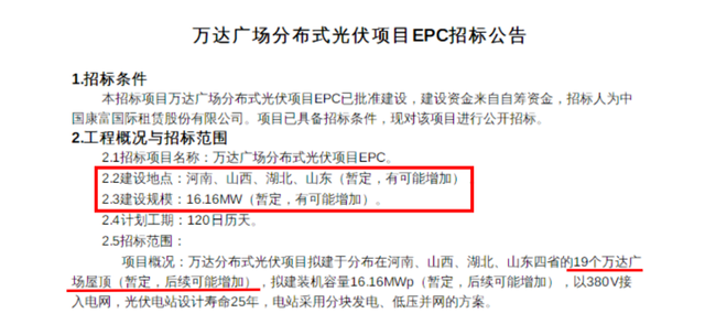 根據(jù)招標(biāo)公告,本次招標(biāo)標(biāo)的為萬(wàn)達(dá)分布式光伏項(xiàng)目完成竣工驗(yàn)收所涉及到的所有報(bào)批、設(shè)計(jì)、采購(gòu)、施工、調(diào)試、檢驗(yàn)、驗(yàn)收及并網(wǎng)工作。項(xiàng)目計(jì)劃建設(shè)總工期為120日歷天。