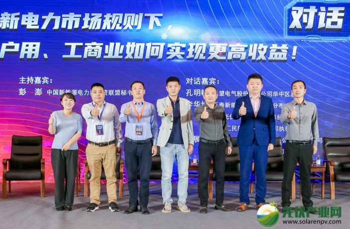大會最后,禾望電氣股份有限公司華中區(qū)總監(jiān)孔明敏、正泰新能科技有限公司分布式南區(qū)總監(jiān)李華旭、TCL光伏科技北方大區(qū)總經(jīng)理陳琳、贛州匯民新能源有限公司執(zhí)行總經(jīng)理羅歆、億多世(中國)融資租賃有限公司上海分公司業(yè)務總監(jiān)郭展恩、金源華興融資租賃有限公司項目總監(jiān)梅飛,在彭澎老師的主持下,一起帶來了精彩紛呈的專題對話——新電力市場規(guī)則下,戶用、工商業(yè)如何實現(xiàn)更高收益!