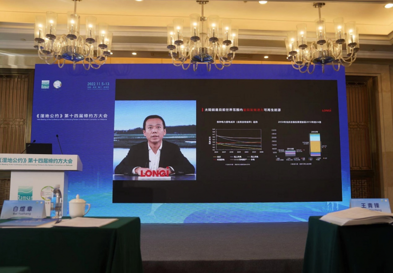在邊會(huì)上,隆基綠能系統(tǒng)解決方案部副總裁倪久建以視頻形式作“光伏推動(dòng)生態(tài)保護(hù) 共建零碳未來(lái)”的主題演講,與濕地、林草領(lǐng)域的多位專家學(xué)者共同探討光伏與生態(tài)的結(jié)合,以及對(duì)生態(tài)、濕地的保護(hù)價(jià)值,為濕地保護(hù)與修復(fù)貢獻(xiàn)智慧、建言獻(xiàn)策。