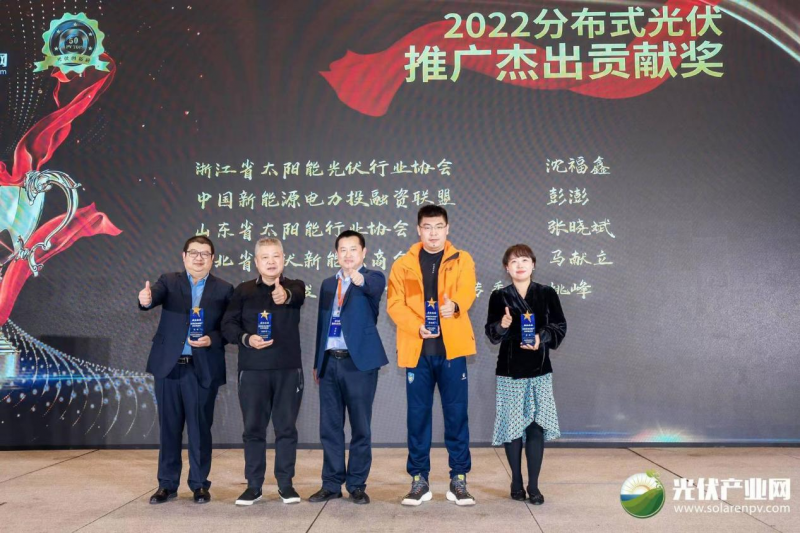 晚會最后還特別給浙江省太陽能光伏行業(yè)協(xié)會沈福鑫、中國新能源電力投融資聯(lián)盟彭澎、山東省太陽能行業(yè)協(xié)會張曉斌、河北省光伏新能源商會馬獻(xiàn)立、河南省產(chǎn)業(yè)發(fā)展研究會新能源專委會姚峰頒發(fā)了2022分布式光伏推廣杰出貢獻(xiàn)獎(jiǎng)。