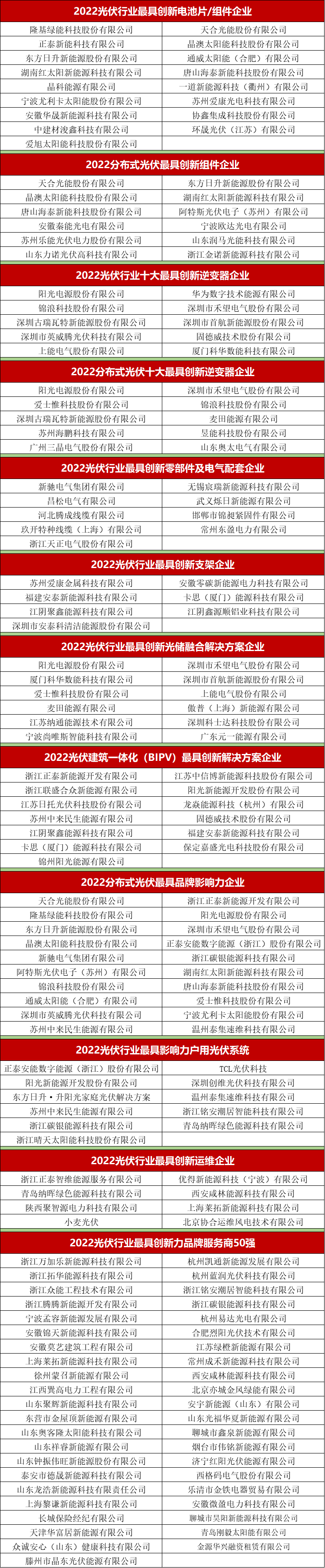 「PV TOP 50」2022光伏創(chuàng)新榜除了發(fā)布“2022光伏行業(yè)最具創(chuàng)新力品牌服務(wù)商50強(qiáng)”榜單,同時(shí)也評選出了“2022光伏行業(yè)最具創(chuàng)新電池片/組件企業(yè)”、“2022分布式光伏最具創(chuàng)新組件企業(yè)”、“2022光伏行業(yè)十大最具創(chuàng)新逆變器企業(yè)”、“2022分布式光伏十大最具創(chuàng)新逆變器企業(yè)”、“2022光伏行業(yè)最具創(chuàng)新零部件及電氣配套企業(yè)”、“2022光伏行業(yè)最具創(chuàng)新支架企業(yè)”、“2022光伏行業(yè)最具創(chuàng)新光儲融合解決方案企業(yè)”、“2022光伏建筑一體化(BIPV)最具創(chuàng)新解決方案企業(yè)”、“2022分布式光伏最具品牌影響力企業(yè)”、“2022光伏行業(yè)最具影響力戶用光伏系統(tǒng)”、“2022光伏行業(yè)最具創(chuàng)新運(yùn)維企業(yè)”等十一大創(chuàng)新獎(jiǎng)項(xiàng)。