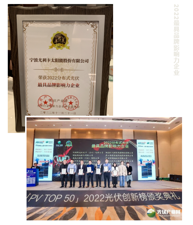 尤利卡太陽能作為特別協(xié)辦單位,受邀出席此次盛會(huì),并榮獲包含2022光伏行業(yè)最具創(chuàng)新電池片/組件企業(yè)、2022分布式光伏最具品牌影響力企業(yè)在內(nèi)的雙料大獎(jiǎng),實(shí)至名歸。