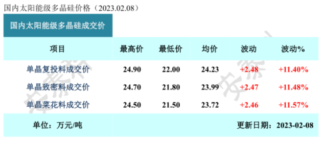 硅業(yè)分會表示,本周硅料價格延續(xù)上漲走勢,周漲幅在11%左右,其中單晶復(fù)投料主流成交價在23.0-24.5萬元/噸,最高價和最低價之間的價差略有收窄,但一、二線企業(yè)成交價仍存在分化,復(fù)投料最低價在22.0萬元/噸,最高價有個別散單在25萬元/噸左右。本周有新訂單成交的企業(yè)數(shù)量超過10家,市場活躍度明顯提升,絕大部分有新成交的企業(yè)訂單已簽至2月中旬,各企業(yè)簽單量都有明顯增加。