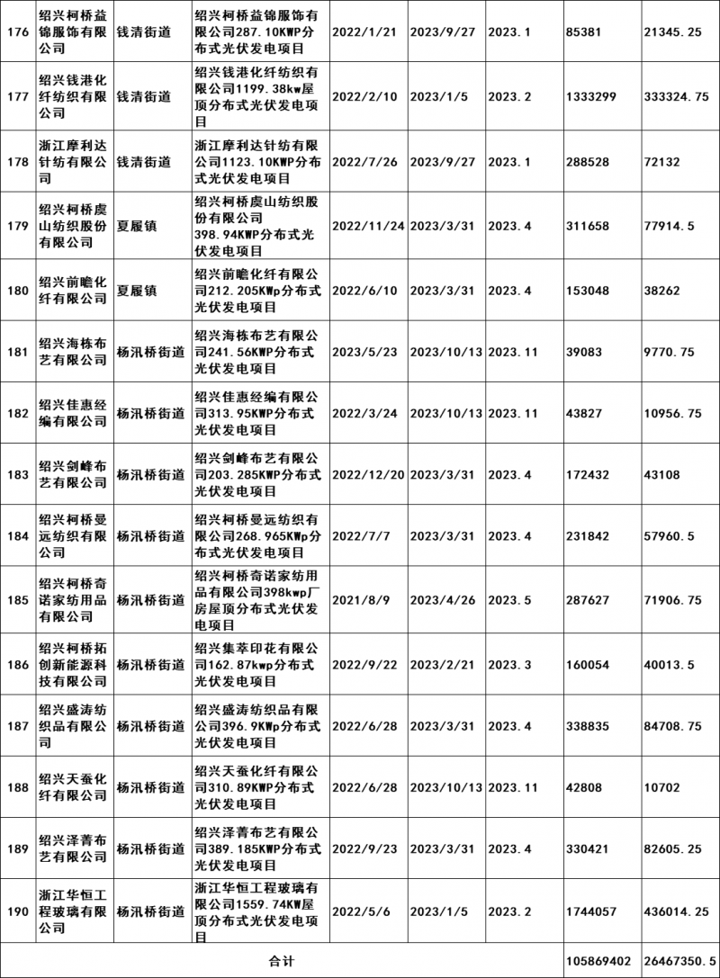我區(qū)2023年度非戶用分布式光伏發(fā)電項目發(fā)電量補(bǔ)助兌現(xiàn)的前期申報工作已經(jīng)完成,根據(jù)審核,共計190個項目符合補(bǔ)助兌現(xiàn)要求,擬補(bǔ)助總發(fā)電量105869402千瓦時,總金額26467350.5元。補(bǔ)助將在公示后通過瑞豐銀行進(jìn)行發(fā)放,具體名單附后。