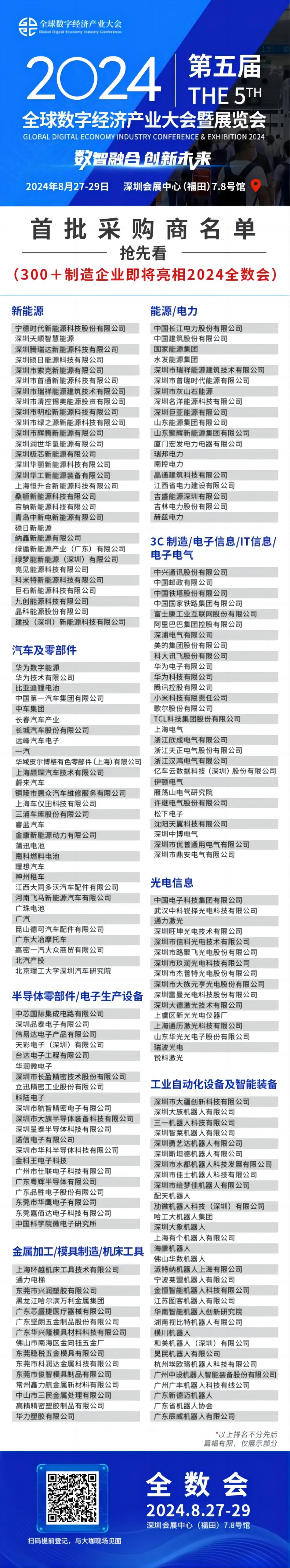 此次公布的300家采購(gòu)商企業(yè),眾多企業(yè)表示是攜明確的采購(gòu)需求觀(guān)展,其中不乏世界500強(qiáng)、數(shù)字經(jīng)濟(jì)領(lǐng)域知名企業(yè),如華為技術(shù)、一汽、長(zhǎng)城汽車(chē)、寧德時(shí)代、長(zhǎng)江電力、電子科技、通力電梯、大疆科技、大族機(jī)器人、通力激光、中國(guó)建筑、科大訊飛、TCL科技、美的集團(tuán)、華星光電、中車(chē)集團(tuán)、歌爾股份、松下電子等。