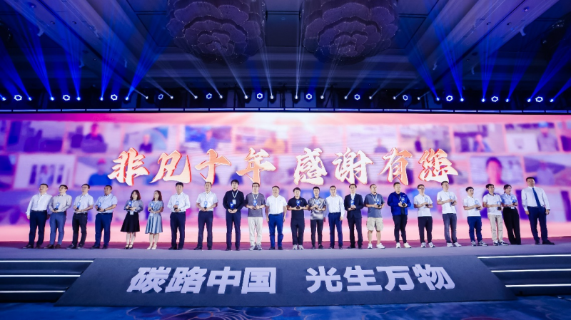 大會(huì)設(shè)置了“十年風(fēng)雨同舟”特別策劃環(huán)節(jié),邀請了多位陪伴華為多年的客戶,現(xiàn)場頒發(fā)了頂部鑲嵌“非凡十年 感謝有您”的紀(jì)念章,該紀(jì)念章取材于十年前的逆變器部件,用時(shí)光鐫刻華為與客戶共同走過的路。