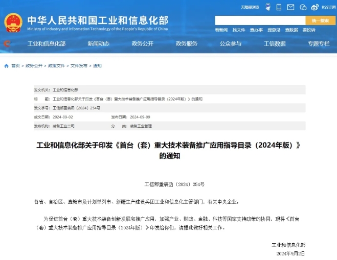 9月10日,工信部發(fā)布《首臺(套)重大技術(shù)裝備推廣應(yīng)用指導(dǎo)目錄(2024年版)》