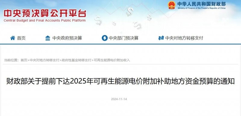 11月14日,中央預決算公開平臺發(fā)布了《財政部關于提前下達2025年可再生能源電價附加補助地方資金預算的通知》。
