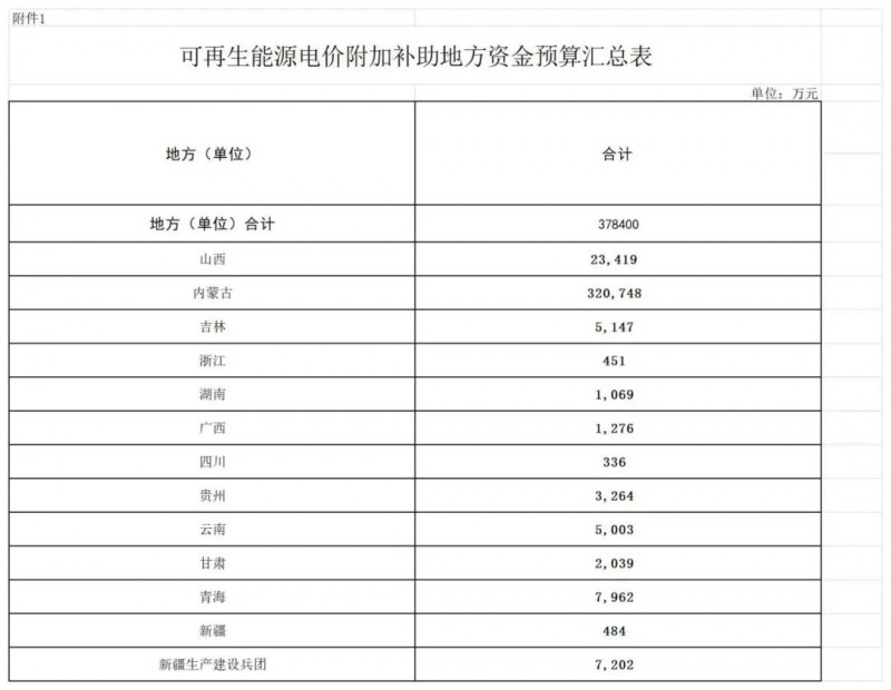 以下是本次可再生能源電價附加補助地方資金預算匯總表: