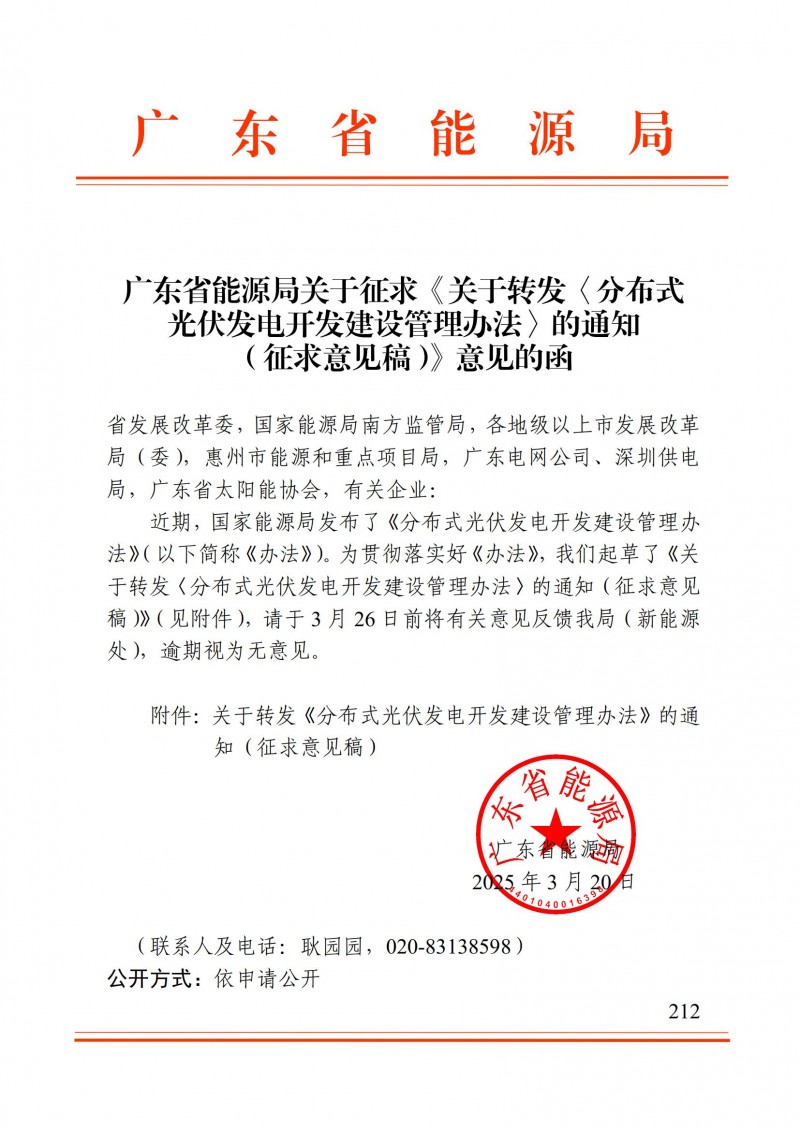 3月20日,廣東省能源局發(fā)布關(guān)于征求《關(guān)于轉(zhuǎn)發(fā)(分布式光伏發(fā)電開發(fā)建設(shè)管理辦法〉的通知(征求意見稿)》意見的函。通知提出: