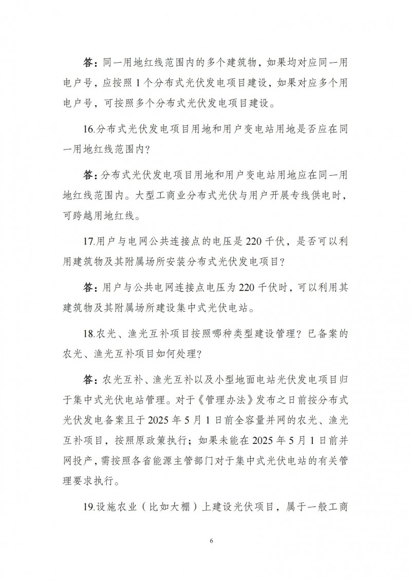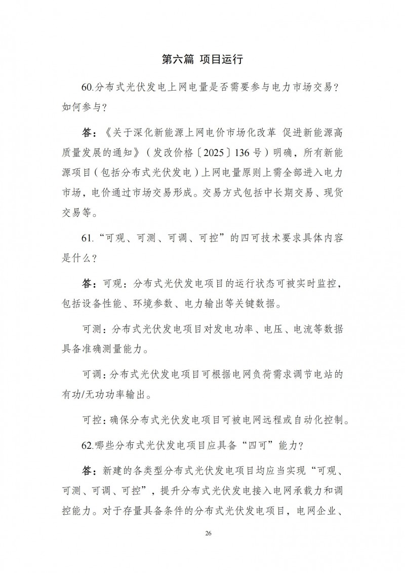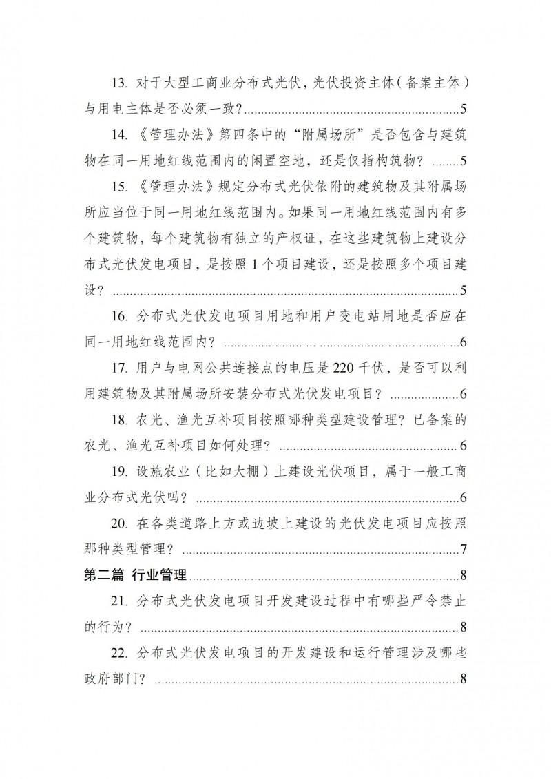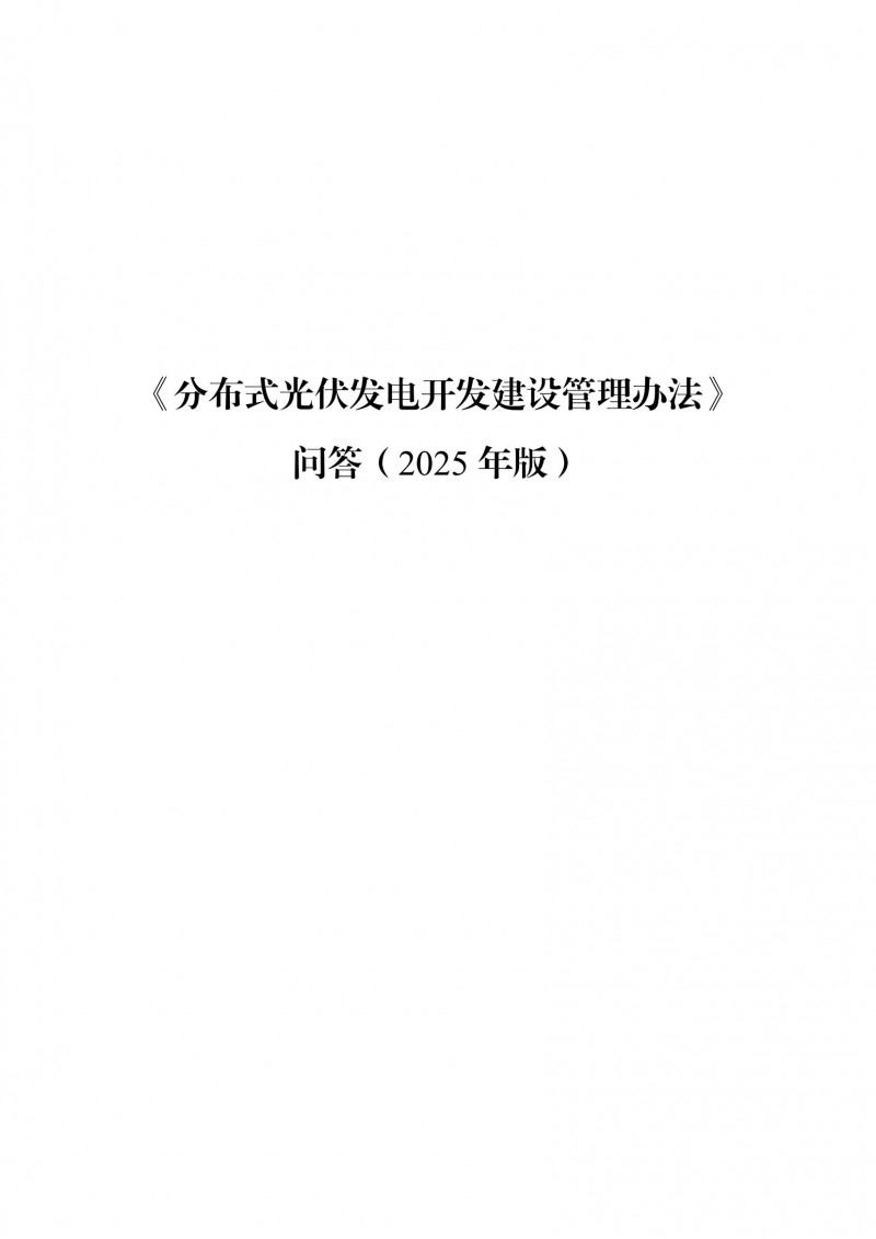 為向社會(huì)更好宣貫《分布式光伏發(fā)電開發(fā)建設(shè)管理辦法》,進(jìn)一步推動(dòng)分布式光伏發(fā)電高質(zhì)量健康發(fā)展,我們組織國家發(fā)展和改革委員會(huì)能源研究所、國家電網(wǎng)有限公司、中國南方電網(wǎng)有限責(zé)任公司、國家電力投資集團(tuán)有限公司、水電水利規(guī)劃設(shè)計(jì)總院、電力規(guī)劃設(shè)計(jì)總院、中國光伏行業(yè)協(xié)會(huì)等有關(guān)單位編寫了《〈分布式光伏發(fā)電開發(fā)建設(shè)管理辦法〉問答(2025年版)》?,F(xiàn)予以公布,供各單位在分布式光伏發(fā)電相關(guān)工作中參考。如有意見和建議,請(qǐng)及時(shí)反饋,我們將根據(jù)有關(guān)情況更新完善。