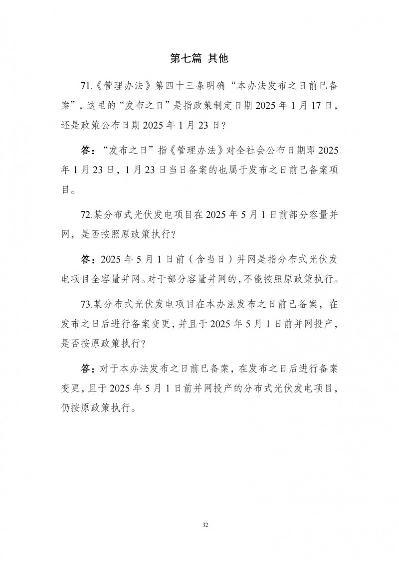 4月11日,國家能源局發(fā)布《〈分布式光伏發(fā)電開發(fā)建設(shè)管理辦法〉問答(2025年版)》,從定義和分類、行業(yè)管理、備案管理、建設(shè)管理、電網(wǎng)接入、項(xiàng)目運(yùn)行等七個(gè)方面73個(gè)問題系統(tǒng)性解讀從業(yè)人員的各種疑問。