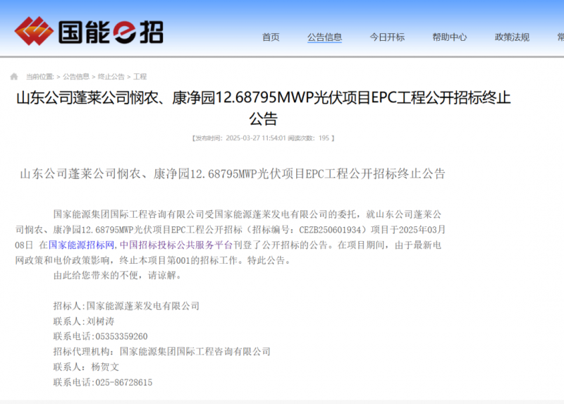 近期,國家能源集團多個分布式光伏項目受最新電網(wǎng)政策和電價政策影響,終止項目EPC招標。