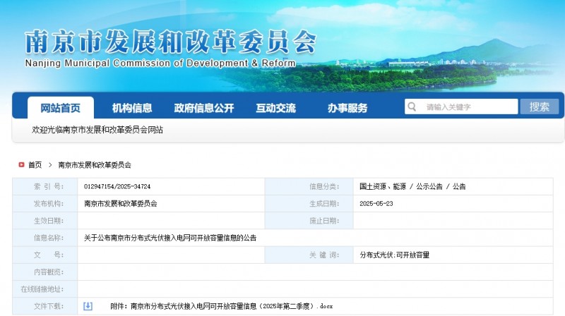 5月23日,南京市發(fā)改委公布《南京市分布式光伏接入電網(wǎng)可開放容量信息》。文件顯示,截至2025年第一季度,南京市分布式光伏接入電網(wǎng)可開放容量約為3428.22MW,其中城區(qū)375.16MW,江寧1011.44MW,江北723.28MW,溧水512.23MW,高淳806.10MW。