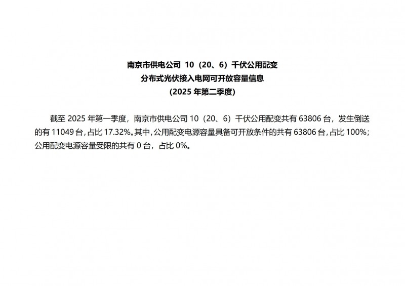 根據(jù)《國家能源局關(guān)于印發(fā)〈分布式光伏發(fā)電開發(fā)建設(shè)管理辦法〉的通知》(國能發(fā)新能規(guī)〔2025〕7號)《江蘇省發(fā)展改革委江蘇能源監(jiān)管辦關(guān)于貫徹落實〈分布式光伏開發(fā)建設(shè)管理辦法〉的實施意見》(蘇發(fā)改規(guī)發(fā)〔2025〕2號)等文件要求,我委組織國網(wǎng)南京供電公司動態(tài)測算分布式光伏接入電網(wǎng)可開放容量,現(xiàn)將測算結(jié)果(數(shù)據(jù)截至2025年3月31日)向社會公開。