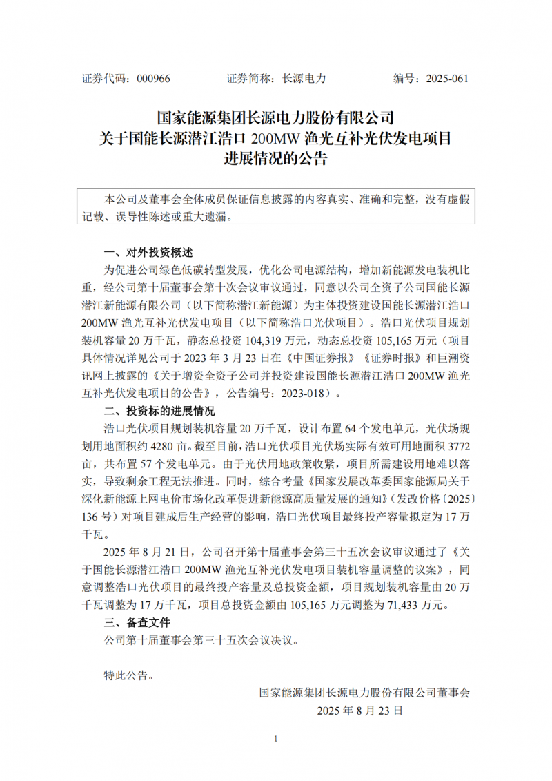 8月26日,國家能源集團長源電力股份有限公司發(fā)布《關于國能長源潛江浩口200MW漁光互補光伏發(fā)電項目進展情況的公告》。