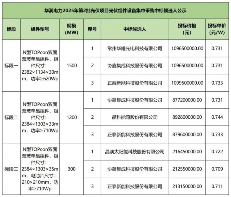 8月18日開標(biāo)的華潤3GW光伏組件集采同樣如此,三個標(biāo)段均價均都在0.7元/W以上,顯著高于當(dāng)前市場水平。根據(jù)此前發(fā)布的中標(biāo)候選人公示,常州華耀光電、協(xié)鑫、晶澳、晶科、正泰五家企業(yè)入圍,投標(biāo)單價0.709~0.744元/W。