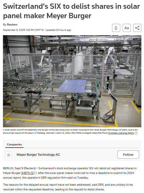 2025年9月9日,瑞士證券交易所SIX監(jiān)管機(jī)構(gòu)正式啟動(dòng)對(duì)梅耶博格(Meyer Burger)的退市程序,原因是這家曾經(jīng)的光伏龍頭企業(yè)未能按