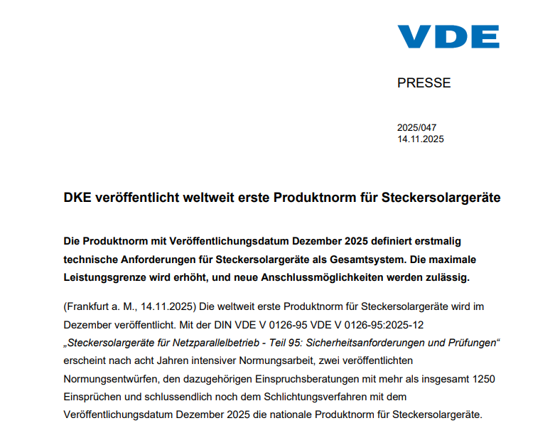 11月14日,德國電工委員會(VDE)宣布,DINVDEV0126-95VDEV0126-95:2025-12《并網運行的插電式光伏設備-第95部分:安全要求和測試》將在歷經八年密集的標準化工作、發(fā)布兩份標準草案、開展相關異議咨詢(共收到超過1250份異議)以及最終的仲裁程序后,于2025年12月正式發(fā)布。