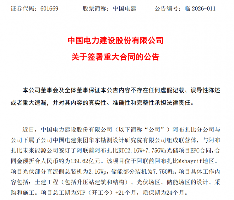 此前,中國電建曾披露,公司阿布扎比分公司與公司下屬子公司中國電建集團(tuán)華東勘測設(shè)計研究院有限公司組成聯(lián)營體,與阿布扎比未來能源公司簽訂了阿聯(lián)酋阿布扎比RTC2.1GW+7.75GWh光儲項目EPC合同,合同金額折合人民幣約為139.62億元。