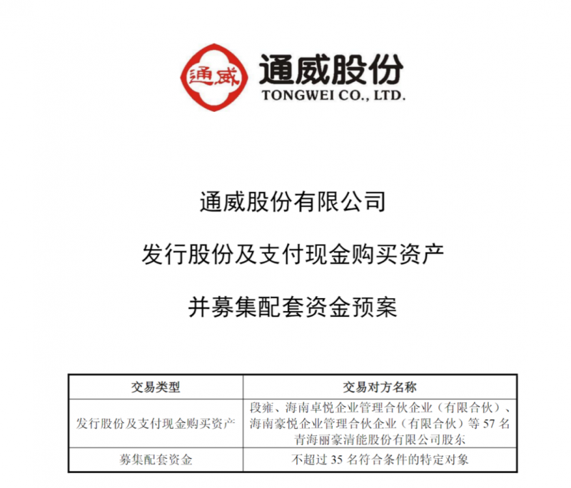 就在不久前,行業(yè)另一龍頭通威股份也正式披露發(fā)行股份及支付現(xiàn)金購買資產(chǎn)并募集配套資金預案,擬通過發(fā)行股份及支付現(xiàn)金相結(jié)合的方式,收購麗豪清能100%股權(quán)。