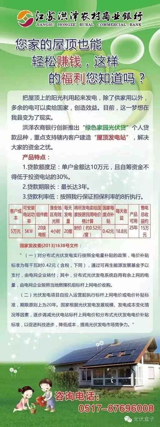 郵儲銀行“光伏貸”產(chǎn)品,重點支持家庭式小型光伏發(fā)電站,最長期限3年,最高不超過5萬元,采用按揭貸款方式,每月需要支付的本息金額較小,大大降低了農(nóng)戶的資金需求。“光伏貸”產(chǎn)品享受發(fā)電有補貼、能自用、高回報的特點,深受贛州農(nóng)戶老表的青睞。目前郵儲銀行贛州分行與十幾家光伏發(fā)電經(jīng)銷商簽訂了合作協(xié)議,實現(xiàn)了全市十八個縣支行“光伏貸”產(chǎn)品業(yè)務(wù)的全覆蓋。