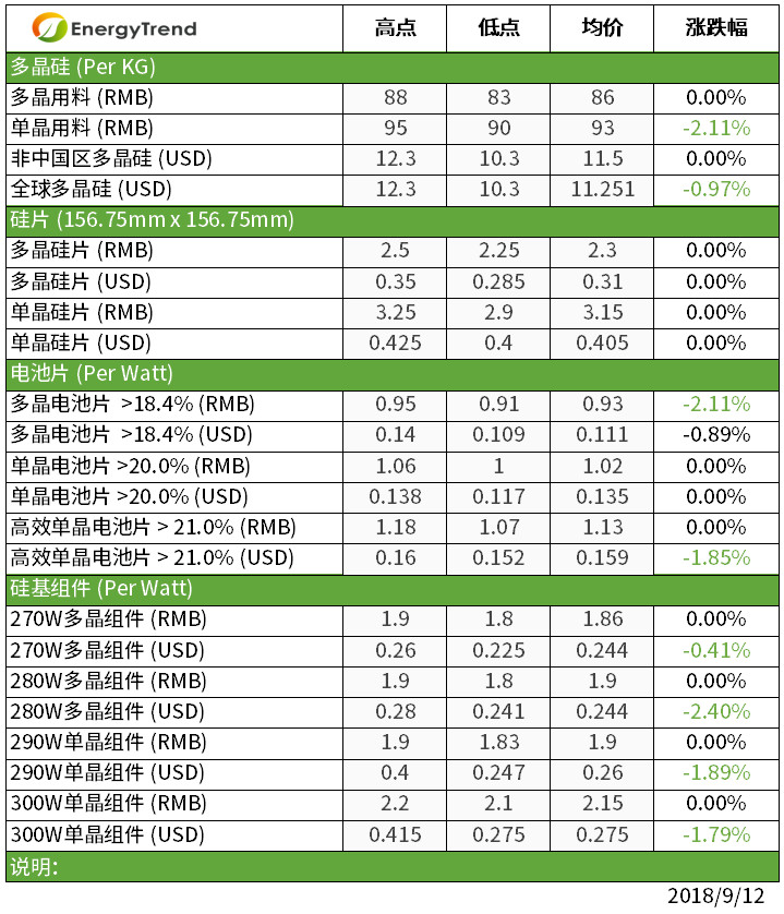 本周大陸國內(nèi)組件雖需求不振,但受成本制約,價格大致持穩(wěn)。高效單晶組件已開始有詢單,估計與第四季領跑者項目的建設有關。目前中國國內(nèi)常規(guī)多晶價格維持RMB1.80-1.90/W,高效多晶也是在RMB1.80-1.90/W的價格。常規(guī)單晶則是RMB1.83-1.90/W的價位,高效單晶在RMB2.10-2.20/W,均價在2.15RMB/W。