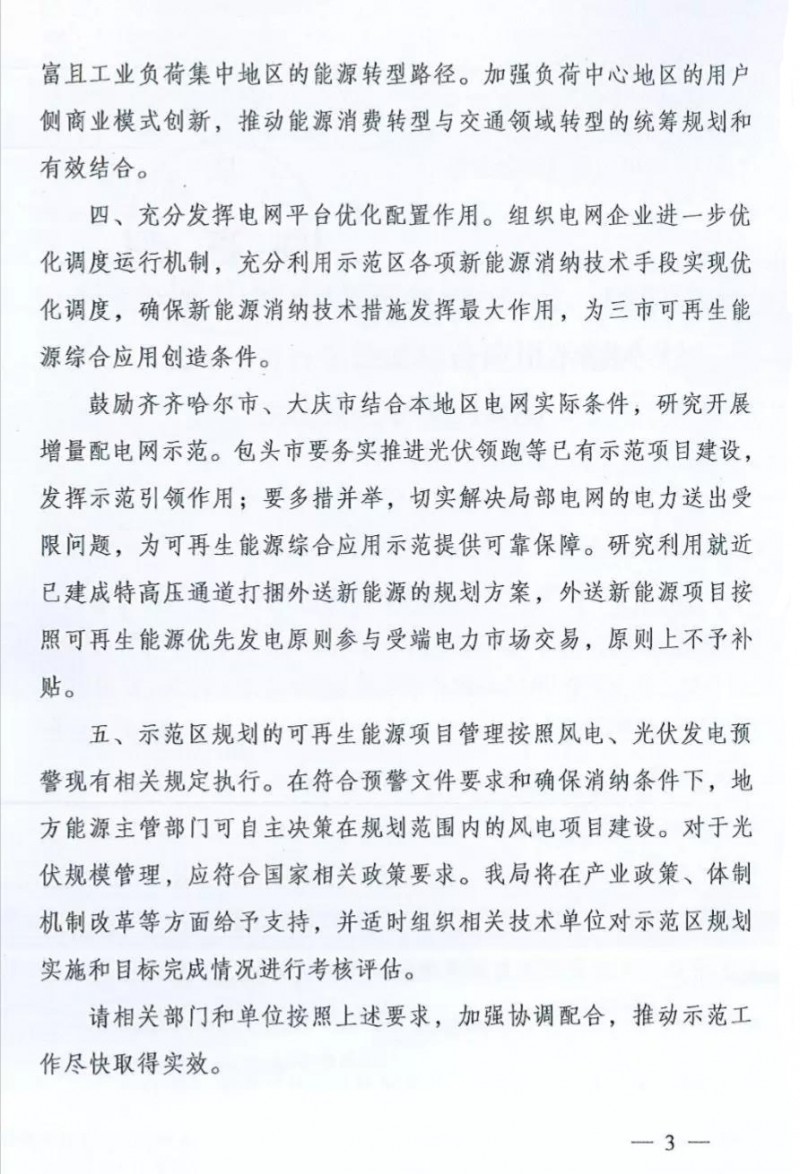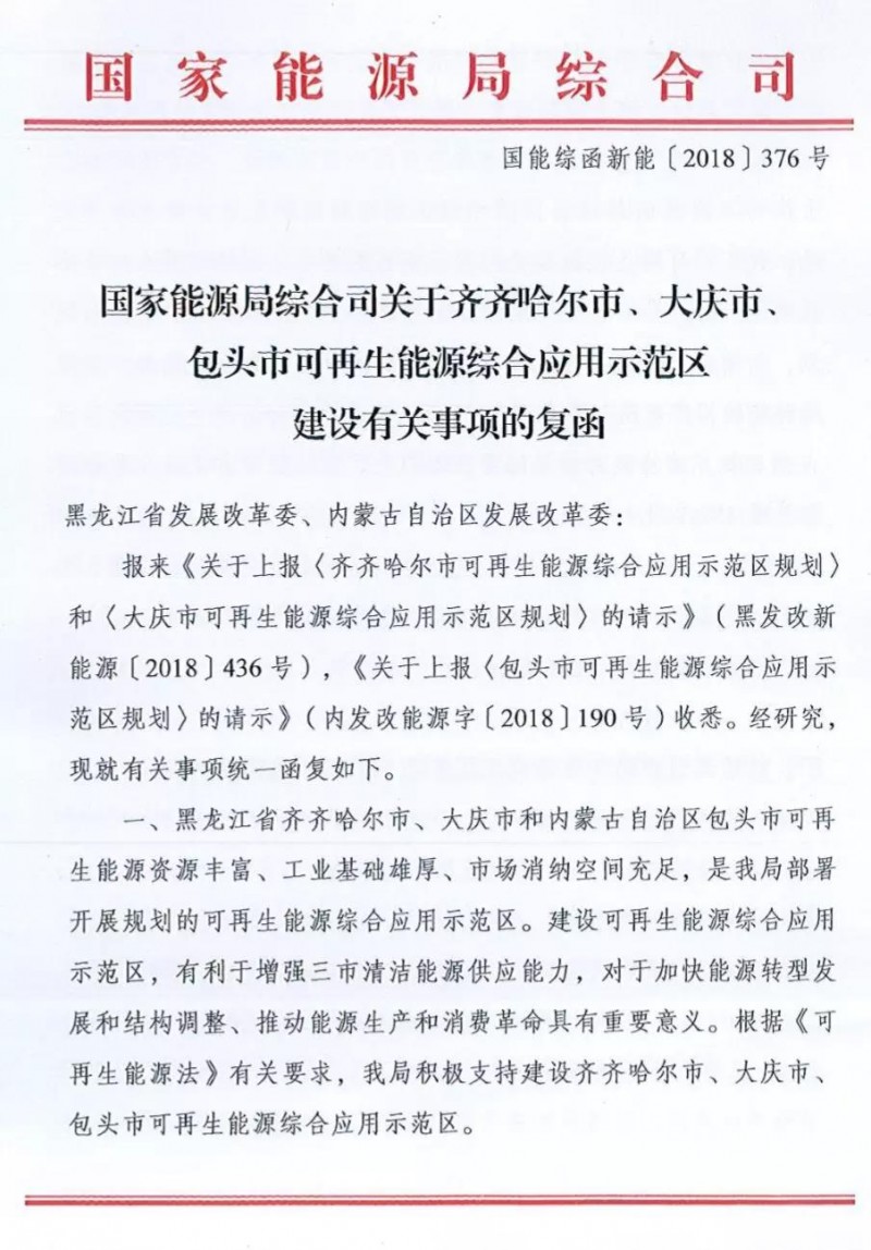 日前,國家能源局綜合司對黑龍江齊齊哈爾市、大慶市,內(nèi)蒙古包頭市上報的關(guān)于可再生能源綜合應(yīng)用示范區(qū)規(guī)劃的請示統(tǒng)一復(fù)函,指出積極支持建設(shè)齊齊哈爾市、大慶市、包頭市可再生能源綜合應(yīng)用示范區(qū)。