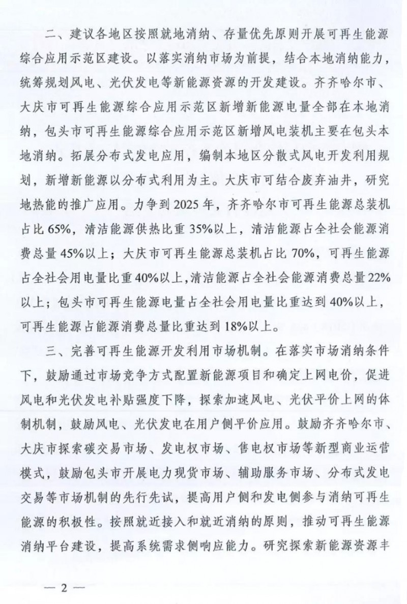 復(fù)函指出,建議各地區(qū)按照就地消納、存量優(yōu)先原則開展可再生能源綜合應(yīng)用示范區(qū)建設(shè)。據(jù)悉,每個城市規(guī)劃了三年1.5GW的光伏發(fā)電規(guī)模(具體數(shù)字和實施方案有待各城市公布),對每年的發(fā)展規(guī)模未做限制;風(fēng)電規(guī)模未知。齊齊哈爾市、大慶市可再生能源綜合應(yīng)用示范區(qū)新增新能源電量全部在本地消納,包頭市可再生能源綜合應(yīng)用示范區(qū)新增風(fēng)電裝機主要在包頭本地消納。