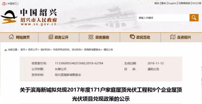 根據(jù)市委、市政府《關(guān)于加快經(jīng)濟轉(zhuǎn)型升級的若干政策意見》(紹市委發(fā)〔2016〕32號)、市府辦《關(guān)于推進紹興家庭屋頂光伏工程建設(shè)的實施意見》(紹政辦發(fā)〔2017〕27 號)、市發(fā)改委《關(guān)于明確家庭屋頂光伏工程建設(shè)中有關(guān)事項的通知》、管委會《濱海新城加快分布式光伏發(fā)電應(yīng)用扶持政策實施細則》(紹濱海委〔2016〕37號)等文件規(guī)定,落實政策兌現(xiàn),發(fā)電量由袍江電力部門提供。其中171戶家庭屋頂光伏工程,按其實際發(fā)電量給予0.2 元/千瓦時的補貼,補貼期限為自發(fā)電之日起五年(之前并網(wǎng)發(fā)電的自本政策執(zhí)行之日2017年6月起補貼五年);9個企業(yè)屋頂光伏發(fā)電項目兌現(xiàn)相關(guān)政策,主要包括以下三部分:項目投資補助(5%*不含稅工程造價)、發(fā)電量補助(0.2 元/千瓦時)、屋頂業(yè)主補助(2元/平方米)。兌現(xiàn)政策的明細見附件?,F(xiàn)按照要求進行公示,公示期限為2018年11月12日至11月21日(7個工作日),如有意見,請及時向我們反映,聯(lián)系電話:0575-89175531,聯(lián)系人:徐先生。