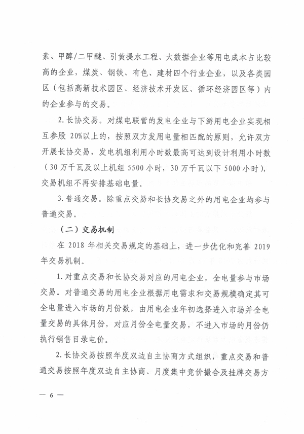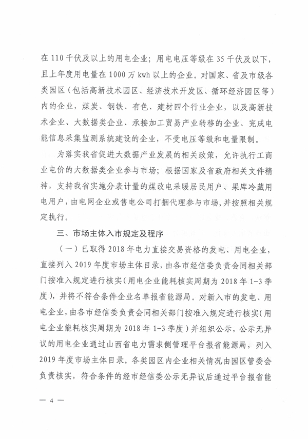 《方案》明確:進一步放寬大工業(yè)用電企業(yè)參與市場的范圍:用電電壓等級在110千伏及以上的用電企業(yè);用電電壓等級在35千伏及以下且上年度用電量在1000萬kwh以上的企業(yè),對國家,省及市級各類園區(qū)(包括高新技術(shù)因區(qū)、經(jīng)濟技術(shù)開發(fā)區(qū)、循環(huán)經(jīng)濟園區(qū)等)內(nèi)的企業(yè),煤炭、鋼鐵、有色、建材四個行業(yè)企業(yè),以及高新技術(shù)企業(yè)、大數(shù)據(jù)類企業(yè)、承接加工貿(mào)易產(chǎn)業(yè)轉(zhuǎn)移的企業(yè),完成電能信息采集監(jiān)測系統(tǒng)建設(shè)的企業(yè),不受電壓等級和電量限制。