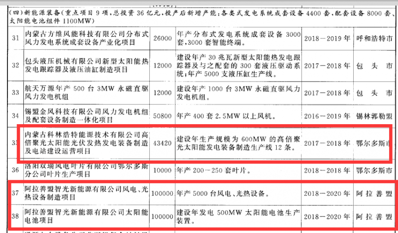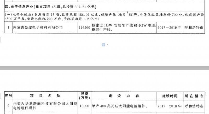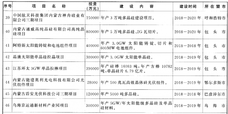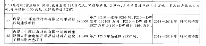 近日,內(nèi)蒙古自治區(qū)印發(fā)了《內(nèi)蒙古自治區(qū)人民政府關(guān)于印發(fā)自治區(qū)新興產(chǎn)業(yè)高質(zhì)量發(fā)展實施方案(2018—2020年)的通知》,該文件的項目匯總中,以中環(huán)、通威、協(xié)鑫、阿特斯、晶澳等為代表的光伏名企紛紛布局了單、多晶硅項目以及高效電池片,總投資達(dá)到近500億元左右;與此同時,這部分企業(yè)也將獲得內(nèi)蒙自治區(qū)的資金獎勵,最高不超過500萬元。