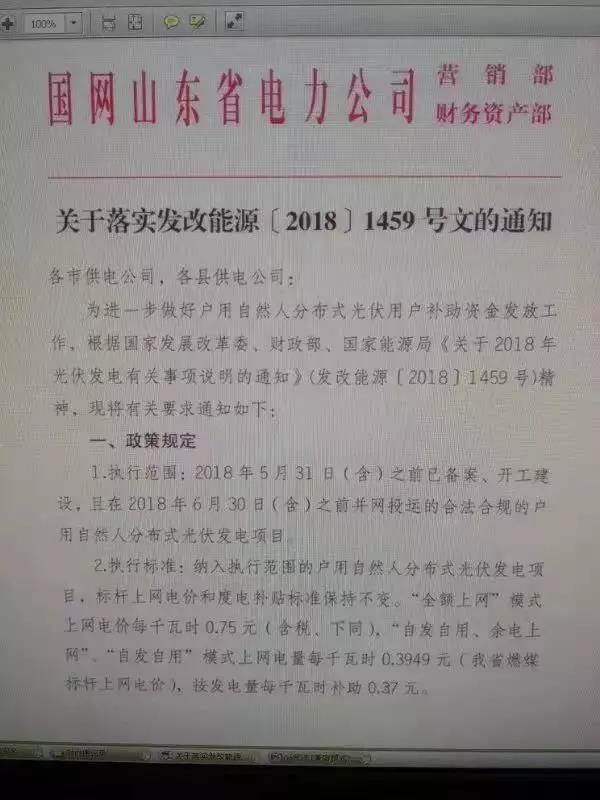2018年12月13日,山東電網(wǎng)公司發(fā)布《關(guān)于落實(shí)發(fā)改能源〔2018〕1459號(hào)文的通知》,明確630前并網(wǎng)的戶用光伏予以補(bǔ)貼。