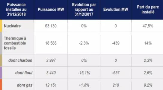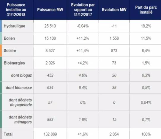 根據(jù)法國國家電網(wǎng)RTE最新發(fā)布的統(tǒng)計(jì)數(shù)據(jù),2018年底法國本土發(fā)電裝機(jī)容量為132.889吉瓦,其中核電63.130吉瓦(47.5%)、水電25.510吉瓦(19.2%)、風(fēng)電15.108吉瓦(11.5%)、天然氣電12.151吉瓦(9.2%)、太陽能發(fā)電8.527吉瓦(6.4%)、燃油發(fā)電3.440吉瓦(2.6%)、煤電2.997吉瓦(2.3%)、生物質(zhì)發(fā)電2.026吉瓦(1.5%)。