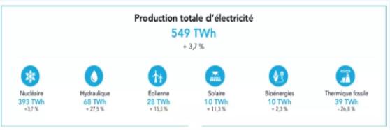 2018年全年法國本土的發(fā)電總量549TWh(5490億千瓦時(shí)),其中核電393TWh(71.6%)、水電68TWh(12.4%)、風(fēng)電28 TWh(5.1%)、火電39TWh(7.1%)、太陽能發(fā)電10TWh(1.8%)、生物質(zhì)發(fā)電10TWh(1.8%)。