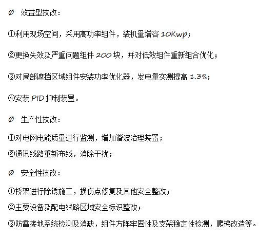 另外,優(yōu)得運(yùn)維結(jié)合客戶需求,推出Doctor U服務(wù)。通過線下細(xì)化排查提出指導(dǎo)性意見,并給出相應(yīng)的技術(shù)改造方案提供給客戶(如下圖),經(jīng)客戶確認(rèn)及簽訂商務(wù)合同后,按照方案對(duì)光伏電站進(jìn)行技術(shù)改造,確保光伏電站的安全高效運(yùn)行,保障電站收益。