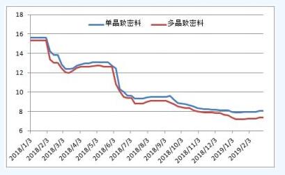 2019年1-2月份國內(nèi)多晶硅價格軟性回彈,單晶致密料價格從1月初的7.96萬元/噸小幅回升至2月底的8.03萬元/噸,漲幅僅有0.9%。多晶致密料價格1月第一周延續(xù)2018年4季度下滑走勢從7.37萬元/噸探底至7.18萬元/噸,隨后小幅反彈至2月底的7.33萬元/噸,比1月初尚有0.5%的跌幅,且月末已現(xiàn)跌勢。2月份單晶致密料均價為7.99萬元/噸,同比大幅下滑41.6%,2月份多晶致密料均價7.31萬元/噸,同比大幅下滑43.6%。