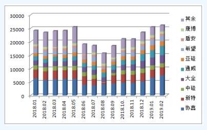 圖2 2018年1月-2019年2月國內(nèi)多晶硅分企業(yè)產(chǎn)量 單位:噸 來源:硅業(yè)分會