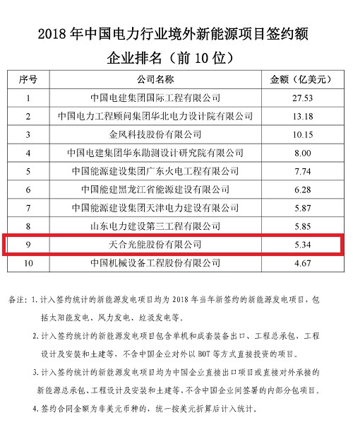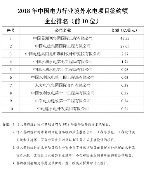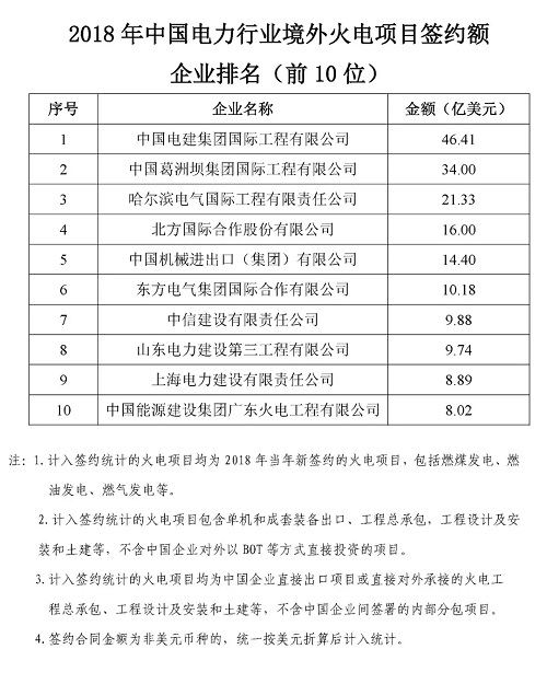 根據(jù)機(jī)電商會統(tǒng)計,2018年,中國電力行業(yè)企業(yè)參與境外電力項目投(議)標(biāo)并最終實現(xiàn)簽約的項目399個,簽約合同總金額466.8億美元,同比增長5.8%,簽約發(fā)電裝機(jī)總?cè)萘?013.7萬千瓦。根據(jù)各重點(diǎn)企業(yè)報送的2018年境外電力項目的新簽約情況,機(jī)電商會對企業(yè)簽約額進(jìn)行了排名。現(xiàn)將排名前50位的企業(yè)名單及各子行業(yè)簽約額排名前10位的企業(yè)名單予以發(fā)布。
