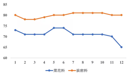 根統(tǒng)計(jì),3月份以來,菜花料的價(jià)格一直持續(xù)下降,跟致密料的價(jià)差也有所增加。就在上周,菜花料的價(jià)格還在63~70元/kg,均價(jià)為65元/kg。