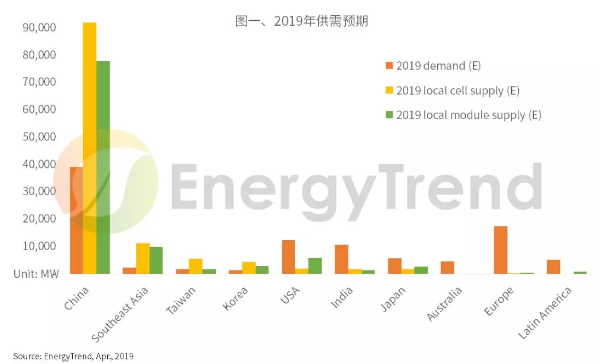 相對(duì)于市場的分散化,供應(yīng)端則持續(xù)往亞洲集中。根據(jù)EnergyTrend的產(chǎn)能數(shù)據(jù)庫,全球電池、組件產(chǎn)能分別有69%、64%設(shè)置于中國,更分別有高達(dá)92%、85%的產(chǎn)能位于印度以外的亞洲地區(qū)。進(jìn)一步分析2019年主要市場的供需狀況,中國大陸、東南亞、臺(tái)灣地區(qū)、韓國均屬供過于求的地區(qū),而美國、印度、歐洲等地則必須從這些地區(qū)進(jìn)口產(chǎn)品以滿足市場需求。