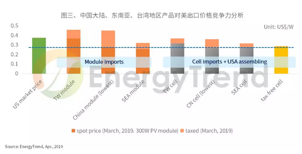 另一案例是美國。美國目前有約2.5GW電池與6.6GW的組件產(chǎn)能,對(duì)于2019年12.5GW的市場仍分別有10GW與5.9GW的需求缺口。土耳其、印度等國地產(chǎn)品雖完全免稅,但其產(chǎn)能有限,產(chǎn)品性價(jià)比亦不如主要的亞洲供貨商,因此美國必定會(huì)從亞洲進(jìn)口產(chǎn)品。在每年2.5GW的電池免稅額度用完后,就需進(jìn)口課稅產(chǎn)品。以臺(tái)灣地區(qū)、中國大陸、東南亞的電池與組件價(jià)格來分析,最具優(yōu)勢(shì)的是東南亞電池加上美國組件封裝,即圖三的藍(lán)線所示。其次是直接由東南亞進(jìn)口組件。