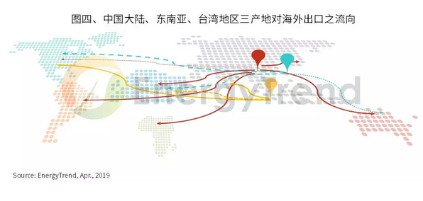 各產(chǎn)地所受限制不同,加上各地生產(chǎn)成本與產(chǎn)品市價(jià)有落差,在供應(yīng)鏈于2H18起劇烈降價(jià)的情況下,各國貿(mào)易壁壘的實(shí)質(zhì)門坎強(qiáng)度不一,全球產(chǎn)品流向亦十分混亂。整體來看,中國產(chǎn)能以其產(chǎn)品性價(jià)比與供貨能力而主宰全球市場;臺(tái)灣地區(qū)以電池片外銷為主,且生產(chǎn)成本偏高,價(jià)格競爭力較弱,外銷空間受到很大的挑戰(zhàn)。相較之下,東南亞產(chǎn)能具有生產(chǎn)成本低、供貨能力穩(wěn)定、出口空間較大等優(yōu)勢(shì)。即使在貿(mào)易壁壘存在的地區(qū),東南亞產(chǎn)能仍可依據(jù)市況變化來調(diào)配,供貨彈性最高。