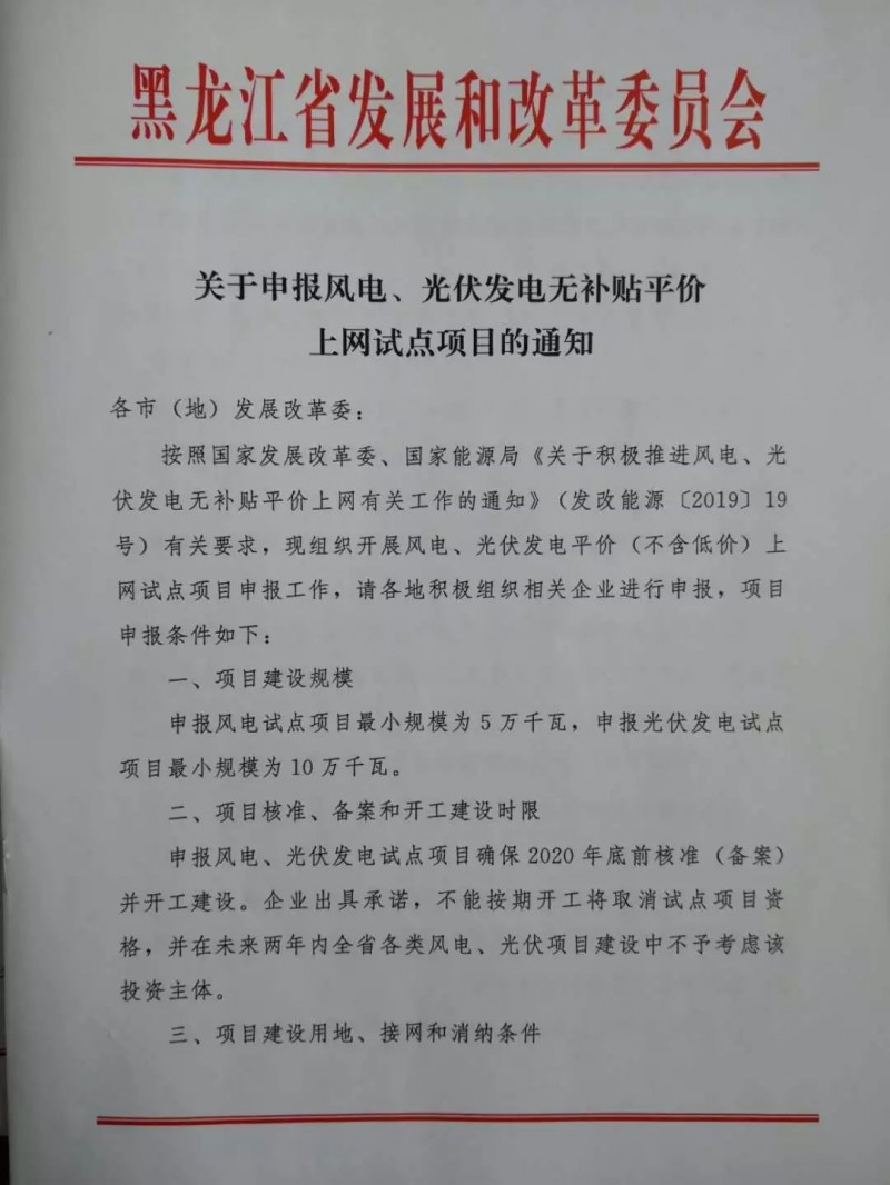 4月8日,黑龍江省發(fā)改委下發(fā)《關(guān)于申報風(fēng)電、光伏發(fā)電無補(bǔ)貼平價上網(wǎng)試點(diǎn)項(xiàng)目的通知》,要求申報風(fēng)電試點(diǎn)項(xiàng)目最小規(guī)模為5萬千瓦,申報光伏發(fā)電試點(diǎn)項(xiàng)目最小規(guī)模為10萬千瓦。試點(diǎn)項(xiàng)目要確保在2020年底前核準(zhǔn)(備案)并開工建設(shè)。不能按期開工將取消試點(diǎn)項(xiàng)目資格,并在未來兩年內(nèi)黑龍江全省各類風(fēng)電、光伏項(xiàng)目建設(shè)中不予考慮該投資主體。