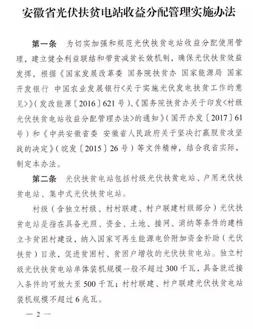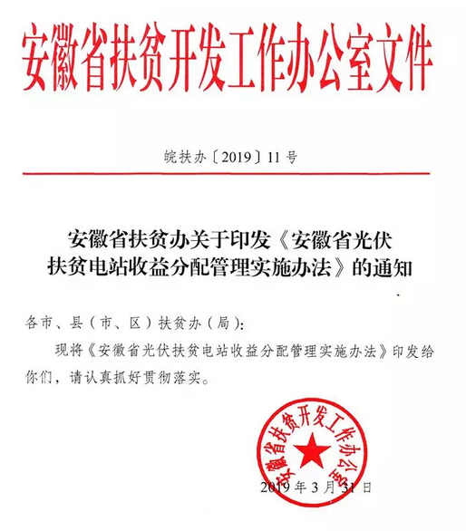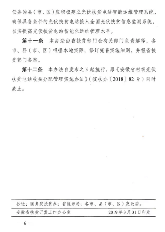 2019年3月31日,安徽扶貧辦印發(fā)新版扶貧管理辦法,原 皖扶辦〔2018〕82號(hào)《安徽省扶貧辦關(guān)于印發(fā)《安徽省村級(jí)光伏扶貧電站收益分配管理實(shí)施辦法》的通知》已廢止。