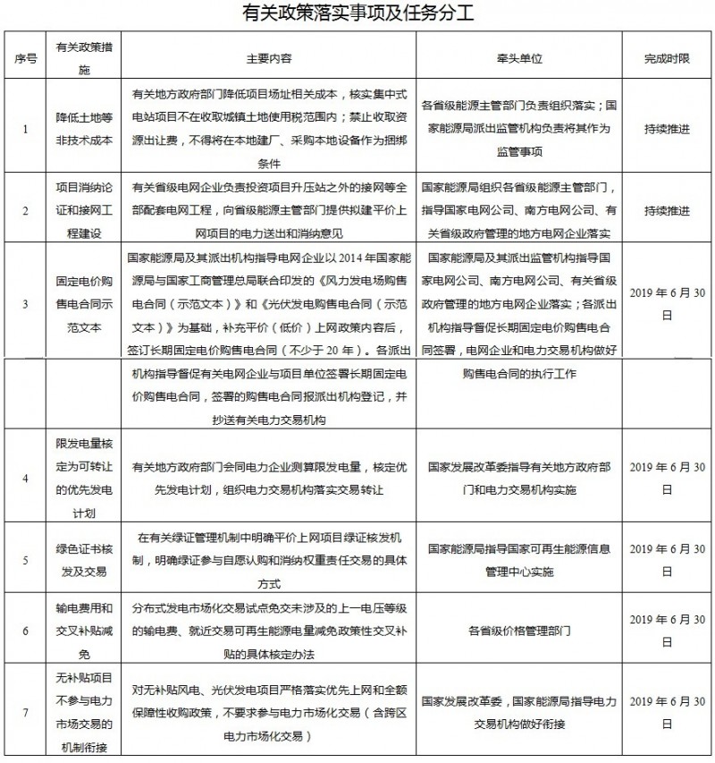 其次,“方案”要求各地區(qū)協(xié)同落實平價上網(wǎng)政策措施。在附件的“有關落實事項及任務分工”中,明確要“降低土地等非技術成本”、同時為了減輕企業(yè)負擔,規(guī)定電網(wǎng)企業(yè)負責項目升壓站之外的接網(wǎng)等全部配套電網(wǎng)工程;此外還對相關項目的售電合同進行規(guī)定,最大程度確保項目20年以上的電量收購、并保證平價上網(wǎng)項目不需要參加電力市場交易。這些利好政策都進行了詳細的歸責,并注明了完成時限。這一切都表明,這次發(fā)改委和能源局是“來真的”。