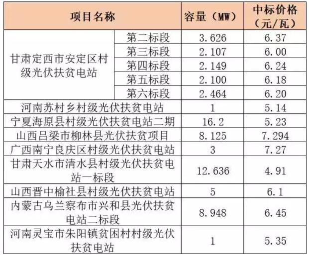 2019年一季度部分光伏扶貧項(xiàng)目EPC中標(biāo)價(jià)格
